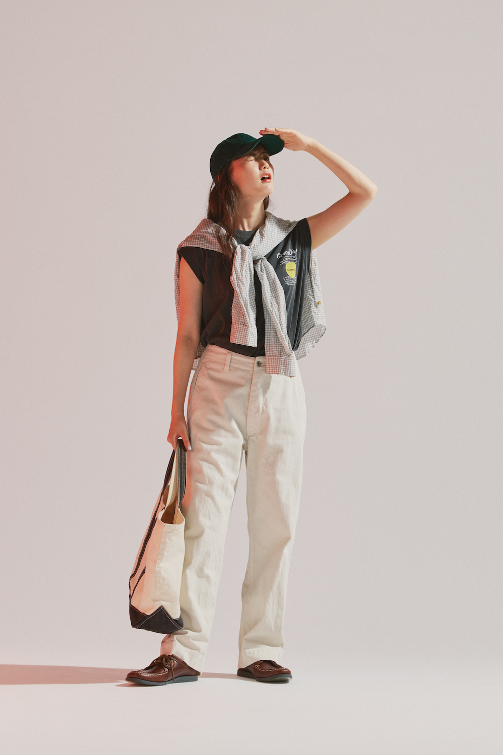 ノースリーブTシャツ¥7150/GOOD ROCK SPEED(グッドスピード)、肩にかけたシャツ¥23980/MASTER&Co.(マッハ55リミテッド)、パンツ¥30800/Véritécoeur(ヴェリテクール)、キャップ¥4620/New Era®(ニューエラ)、バッグ¥12100/L.L.Bean(エル・エル・ビーン カスタマーサービスセンター)、シューズ¥58300/QUODDY(メイデン・カンパニー)