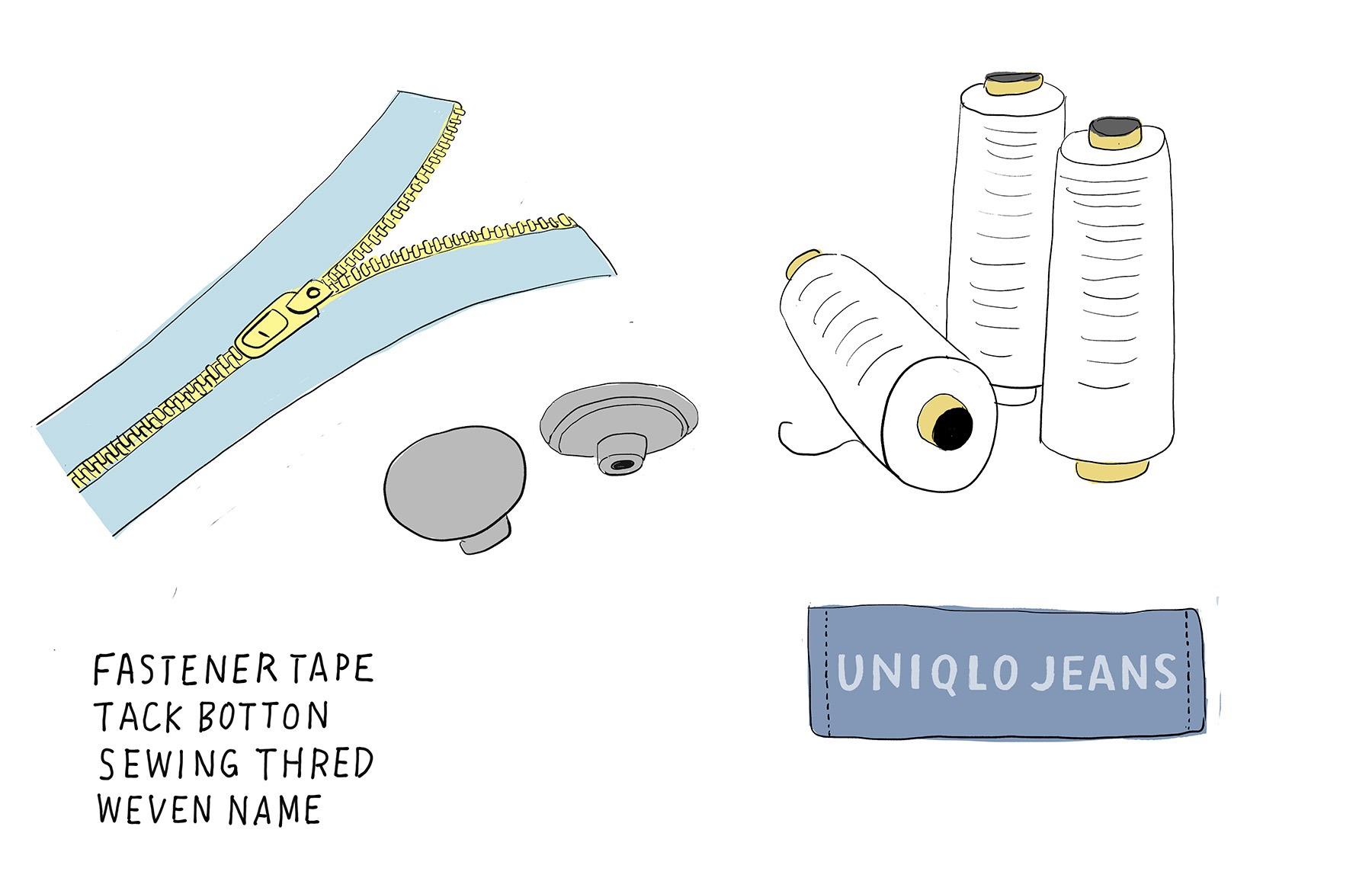 ユニクロジーンズのパーツは、さまざまなリサイクル素材で構成されています。ネームタグ、縫製する糸※、ファスナーテープはいずれもペットボトルを再生してつくられたリサイクルポリエステル製。スナップボタンを成形する際に発生する真鍮の端材は100%リサイクルされ、フロントなどの金属ボタンに使用されます。スナップボタンを構成するパーツを真鍮からアルミ素材に変えることで、大幅な節水も実現できたといいます。