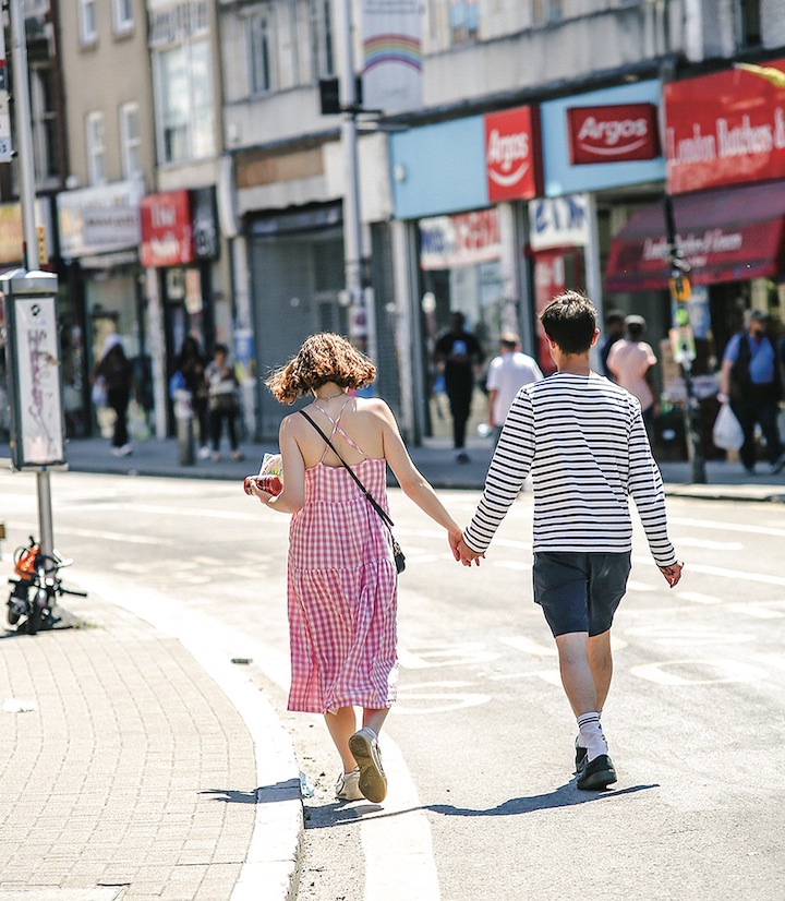 街にダークカラーが増える秋冬こそ、あえてビ ビッドな色を使って差を出すのもあり。赤の オーバーオールは、ワイドに広がるデザインが 今っぽい。足首が見えるようにカットオフされ たボトム丈が絶妙で、インナーやスニーカーを 白にすれば、爽やかな着こなしが 叶う。また、 首にかけたヘッドホンがリュックの黒とお揃い なのもポイント高め。ロンドンガールらしい飾らないカジュアルスタイルは、ヘルシーな素肌 見せでクールさと可愛さの両立を実現。