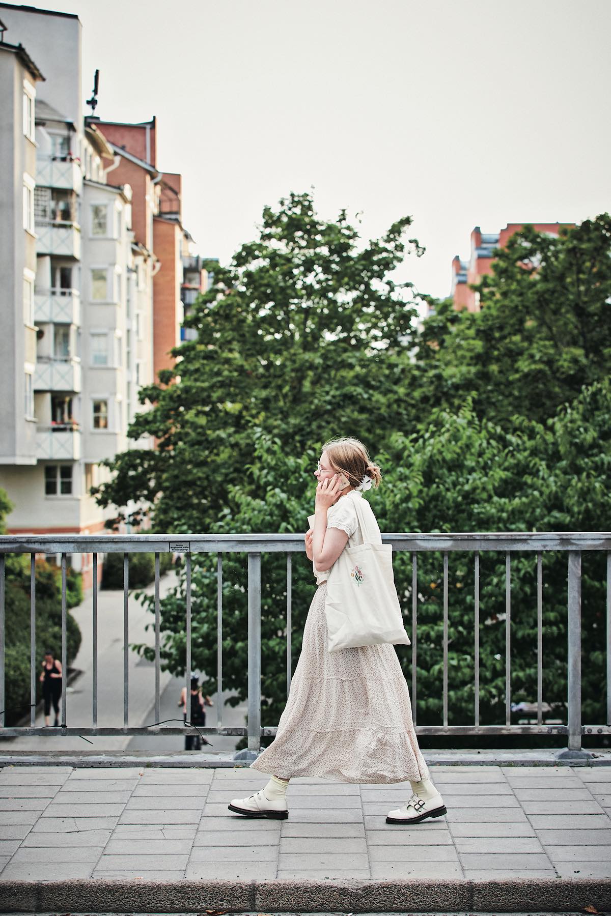 ワンピース/お母さんのおさがり、腰に巻いたパーカ/Gina Tricot、バックパック/PUCCINI、スニーカー/友達からのギフト、時計/FitBit
