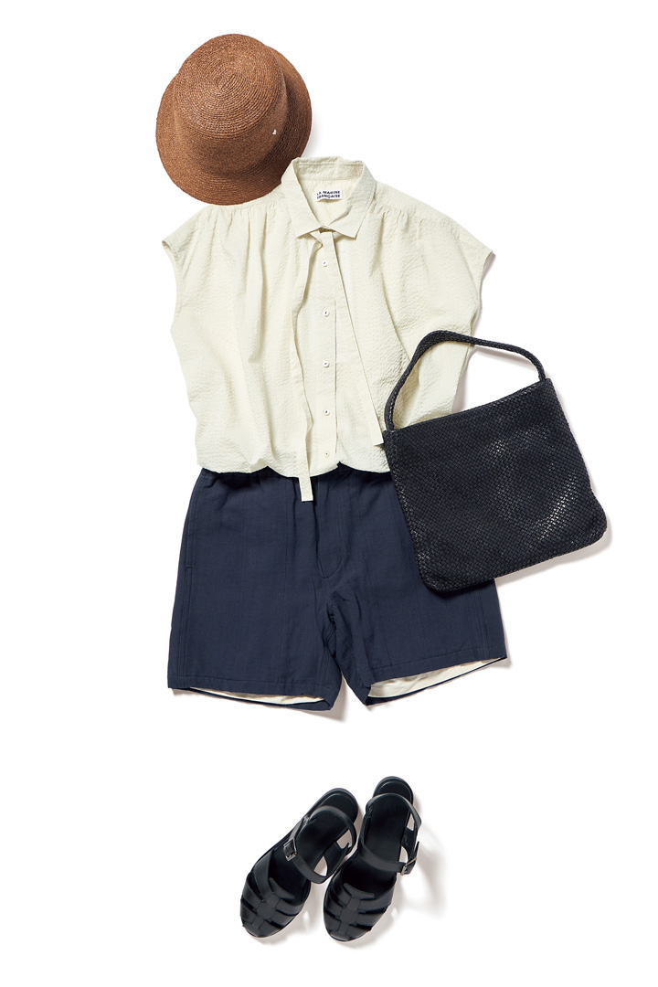 ブラウス¥15400/LA MARINE FRANÇAISE(マリン フランセーズ代官山店)、ショートパンツ¥31900/YAECA(ヤエカ アパートメント ストア)、ハット¥42900/HELEN KAMINSKI(ヘレンカミンスキー ギンザシックス)、バッグ¥35200/maison de soil(ジャーナル スタンダード ラックス 表参道店)、サンダル¥55000/Paraboot(パラブーツ青山店)