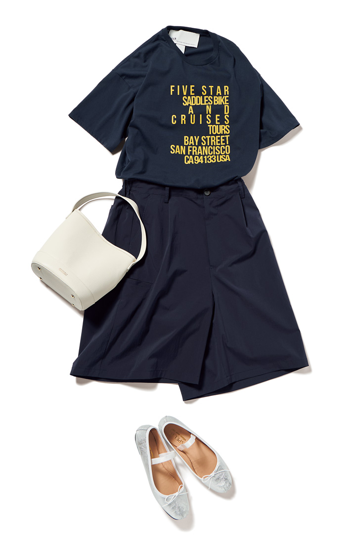 Tシャツ¥10780/TICCA(ティッカ)、ショートパンツ¥19800/BASISBROEK(インス)、バッグ¥17600/MACKINTOSHPHILOSOPHY GREY LABEL(マッキントッシュ フィロソフィー グレー ラベル ルミネ新宿店)、シューズ¥40700/SPELTA(フラッパーズ)