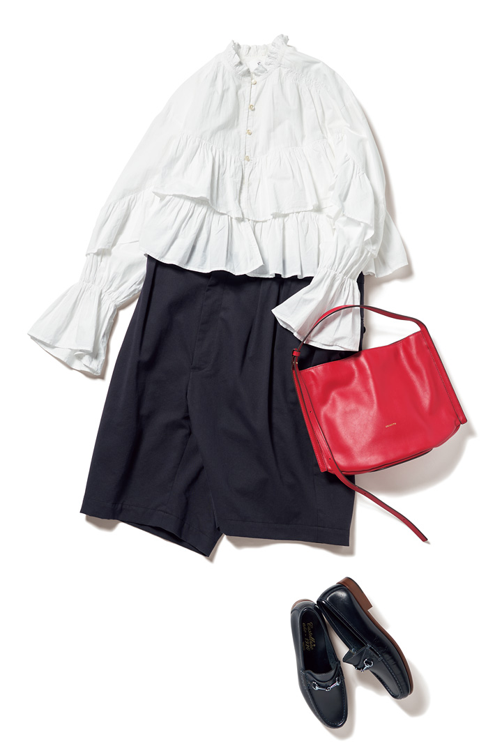 ブラウス¥28600/Sara mallika(パサンド バイ ヌキテパ)、ショートパンツ¥31900/Y(イレーヴ)、バッグ¥35200/ORSETTO(オルサ)、シューズ¥46200/CASTELLANO(フラッパーズ)