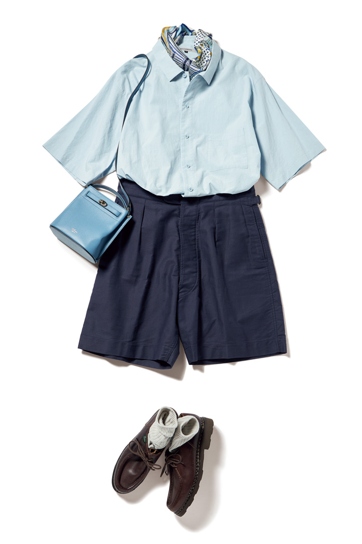 シャツ¥23100/BASISBROEK(インス)、ショートパンツ¥31900/ANATOMICA(アナトミカ 東京)、スカーフ¥22000/manipuri(マニプリ)、バッグ¥158400/Mulberry(マルベリージャパン)、シューズ¥94600/Paraboot(パラブーツ青山店)、ソックス/スタイリスト私物