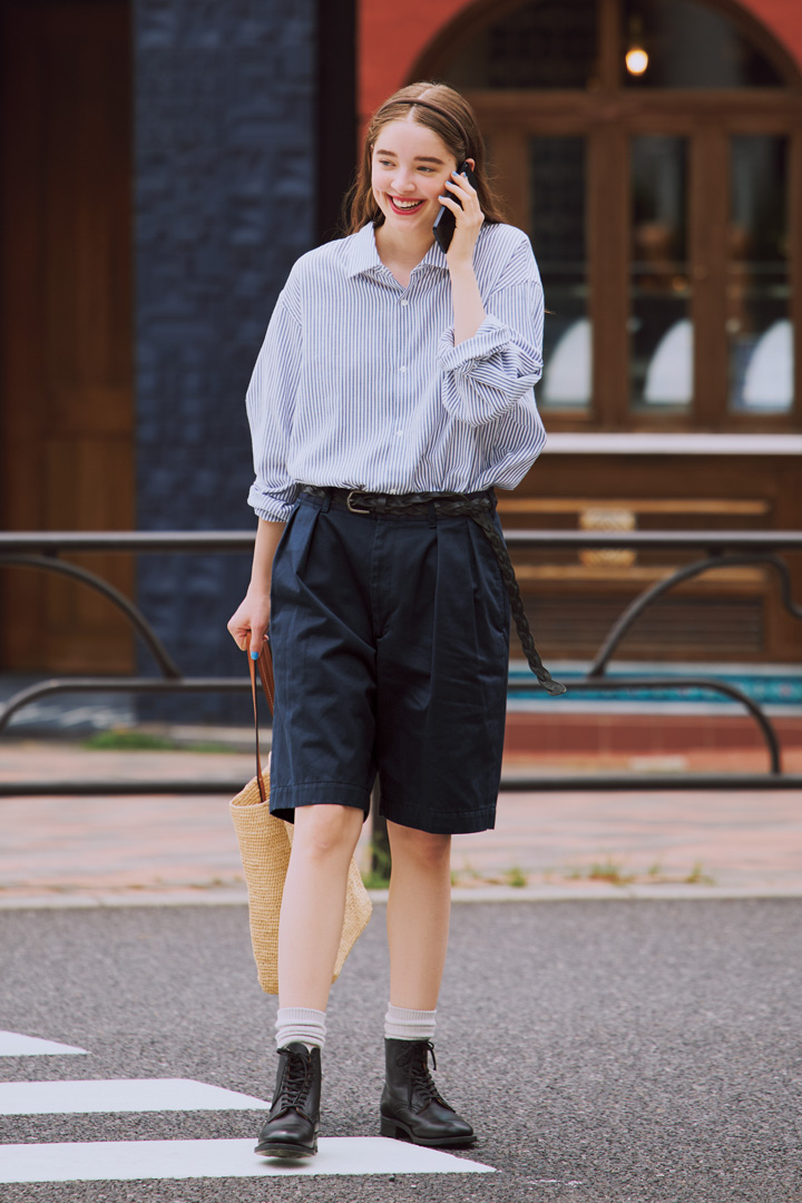 ショートパンツ¥27500/nanamica(ナナミカD.W.S.)、シャツ¥28600/YAECA(ヤエカ アパートメント ストア)、ベルト¥17600/Broe&Co(ビューカリック&フロリック)、カチューシャ¥8800/Jardin des cheveux(ジャルダン ドゥ シュブー)、バッグ¥73700/HELEN KAMINSKI(ヘレンカミンスキー ギンザシックス)、その他/スタイリスト私物