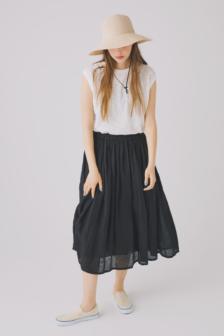 カットソー¥7150/SOIL(ビューカリック&フロリック)、スカート¥39600/maison de soil(メゾン ド ソイル 恵比寿店)、ハット¥7920/HELLY HANSEN(ヘリーハンセン原宿店)、スニーカー¥11000/VANS(ヴァンズジャパンカスタマーサポート)