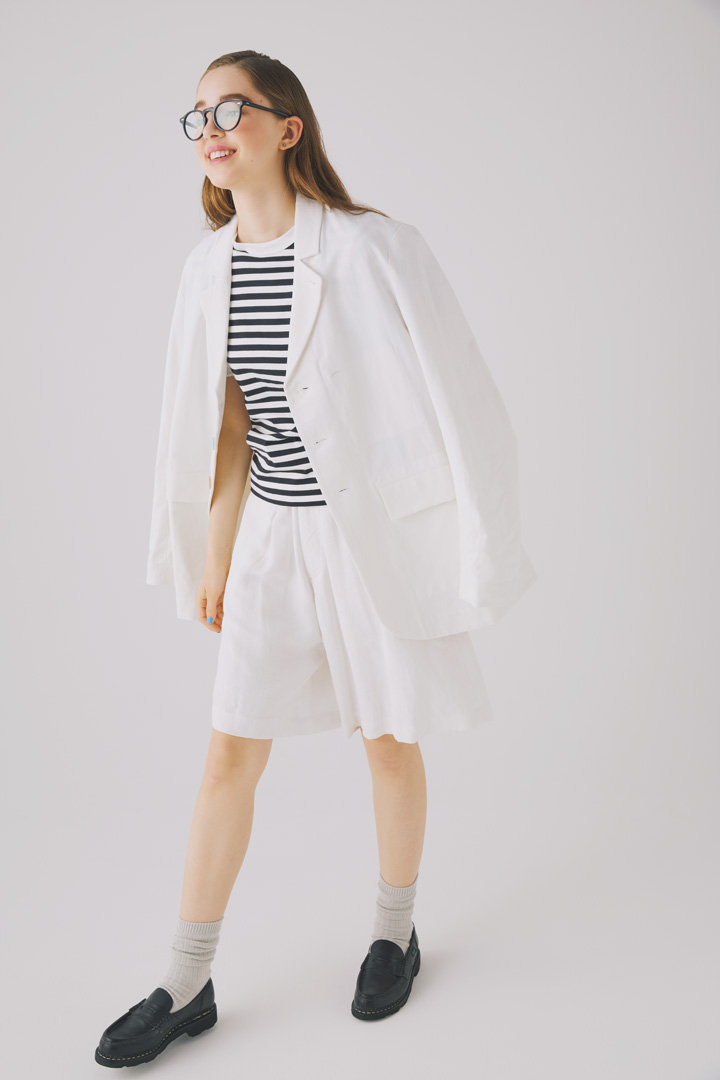 ジャケット¥74800 、ショートパンツ¥49500/ともにWRIGHT&DOYLE(ワングラムチャン)、Tシャツ¥6380/BEAMS BOY(ビームス ボーイ 原宿店)、メガネ¥45980/Oliver Peoples(ルックスオティカジャパン カスタマーサービス)、シューズ¥94600/Paraboo(t パラブーツ青山店)、ソックス/スタイリスト私物