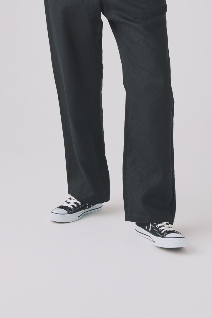 ストンと落ちるストレートシルエットのパンツ。世界的に有名なリネンの産地、コルトレイクでつくられた高品質なリネンの中番手糸を使用したオリジナル生地。