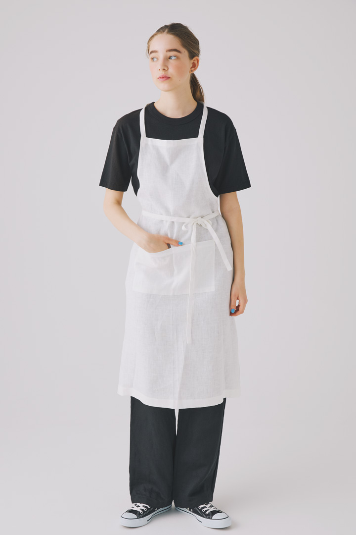 Tシャツ¥9900/MEYAME(ソークロ二クル)、エプロン¥7590/fog linen work(フォグリネンワーク)、パンツ¥33000/n.VB(アテンション・ジャパン・プロダクツ)、スニーカー¥6380/CONVERSE(コンバースインフォメーションセンター)
