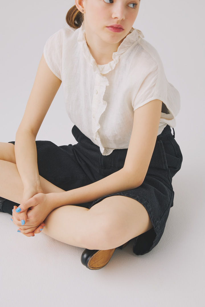 フリルが愛嬌たっぷりなフレンチスリーブのシャツ。上質な60番手のリネン糸を使用し、丁寧に織り上げられた生地はなめらかでやや光沢感があり、ナチュラルながらも品のある仕上がり。