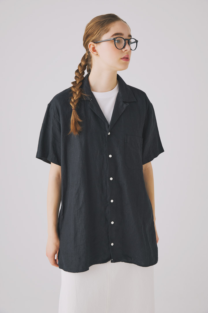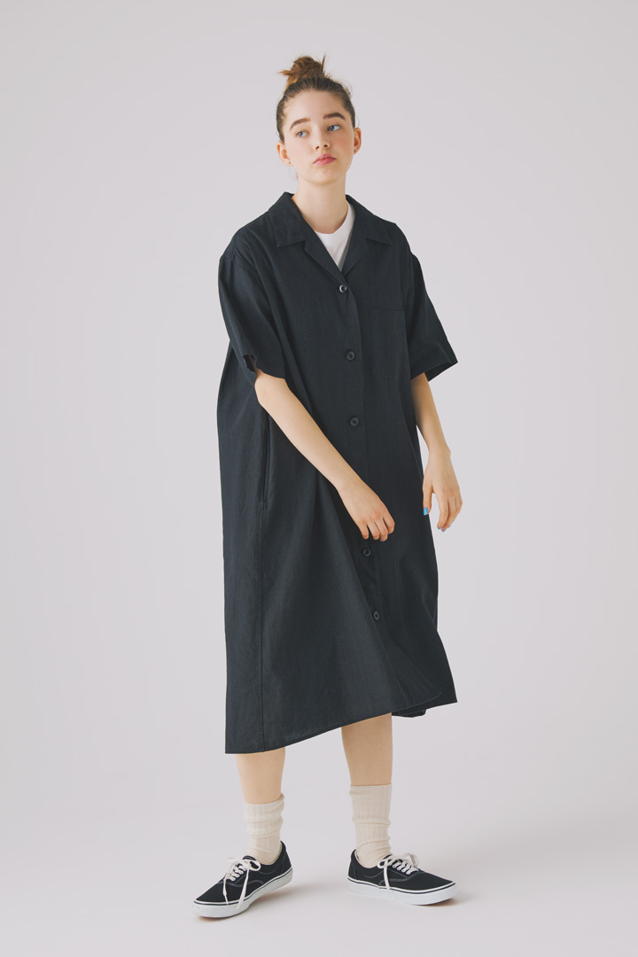 抜け感のある開襟ワンピースは、リネン55%、コットン45%の平織素材。タテ糸の中白染めによる奥行きのあるブラックが素敵。