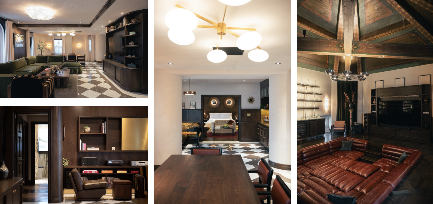 63室あるスイートルームの中でひときわ象徴的なのが、往年のハリウッドスター、クラーク・ゲーブルとキャロル・ロンバードの名前を冠した「ゲーブル・ロンバード・ペントハウス」。1930年代、ふたりが密かに逢瀬を重ねた場所として知られています。約300㎡の広さを誇る2階建てのペントハウスには、まるでプールのようなレザーソファーを配したシアタールームも完備。