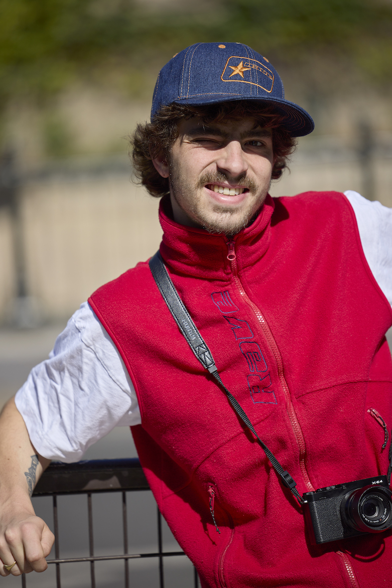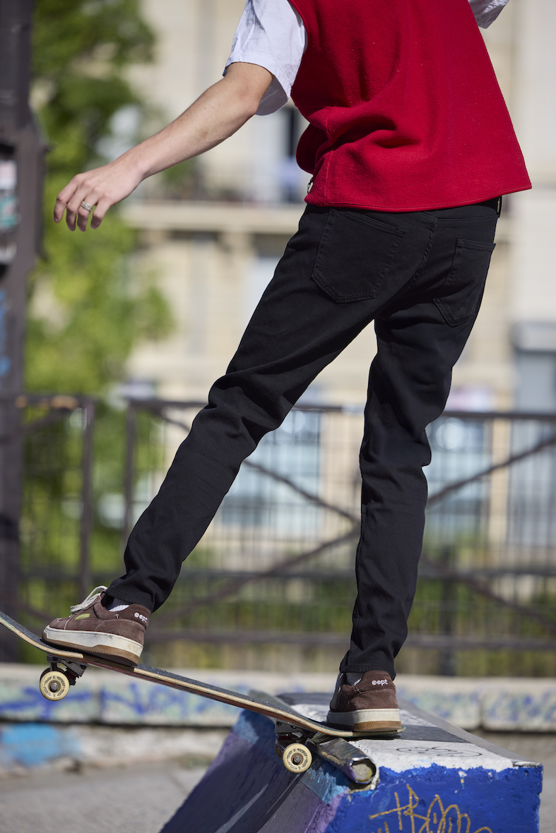 だらだらと長い夏も、終盤になれば秋の気配をはらんだ風を感じる一瞬が重なっていきます。いつもの半袖Tシャツスタイルにベストを1枚加えたら、そんな秋の気分にスイッチ可能。 「このEZYジーンズは生地の厚みがちょうどいい。ストレッチが効いていて、スリムシルエットなのにそのことを忘れてスケートできるほど動きやすい。肌へのあたりも温かで、丈夫で転んでも大丈夫だったよ」と照れ笑い。 窮屈さを感じさせないスリムフィットの絶妙なパターン設計は、カジュアルすぎないクリーンなシルエットを生み出しています。どこか洗練されたルックスが、ストリートスタイルにも上品さを損なわない着こなしにつながっているのかもしれません。
