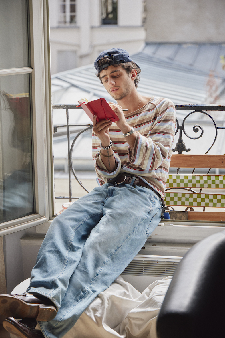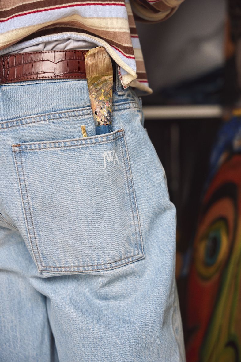 「このJWAストレートは、とても軽くて、穿いていてすごく快適なところが気に入りました。クラシックなストレートで、ウエストを落として穿いても、ハイウエストで穿くこともできて楽しいね」 ストンと落ちるパンツとTシャツのシルエットを、絶妙な丈感のコントロールで調和させるセンスが、多色の柄物も難なくまとめるバランス感覚。丈の組み合わせに気を配ることで、ボリュームコントロールの秘訣が見つかりそうです。