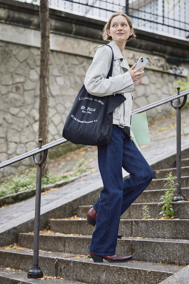 「私が持っているデニムはみな固い生地なので、このスリムフレアジーンズの見た目とのギャップには驚きました。本当にソフトで穿き心地がいい。ブラックカラーを選んだのは、カジュアルにもクラシックにも着こなせそうだから。レイジーな気分の日には、グラフィックTシャツと合わせたいな」