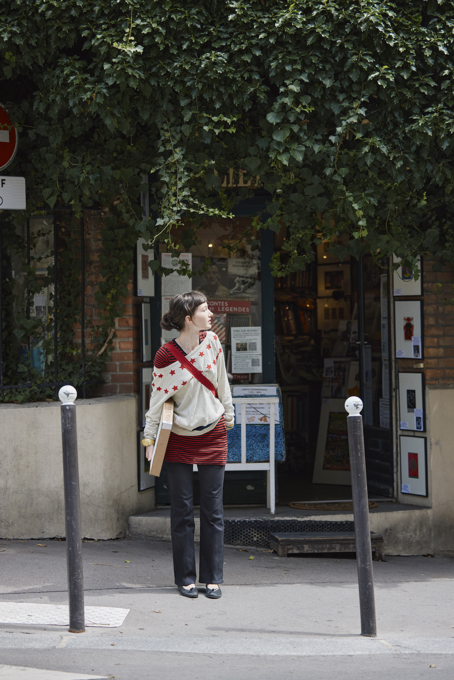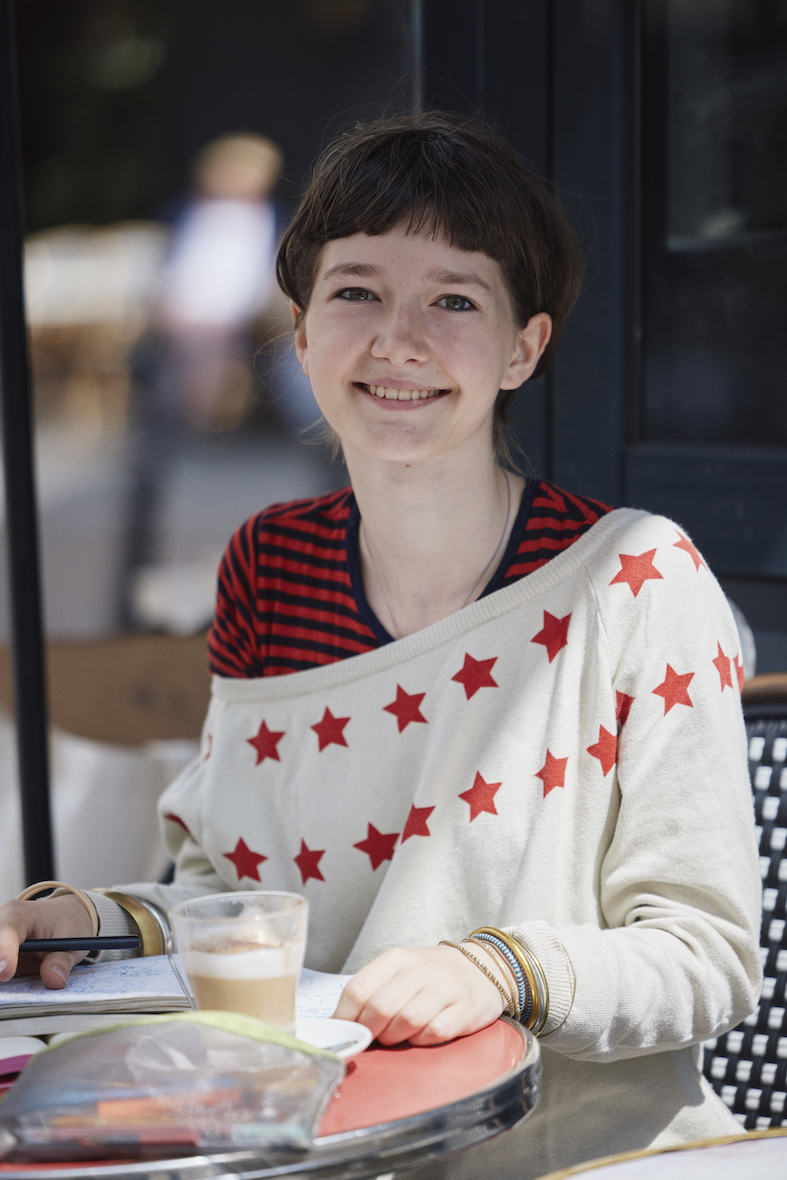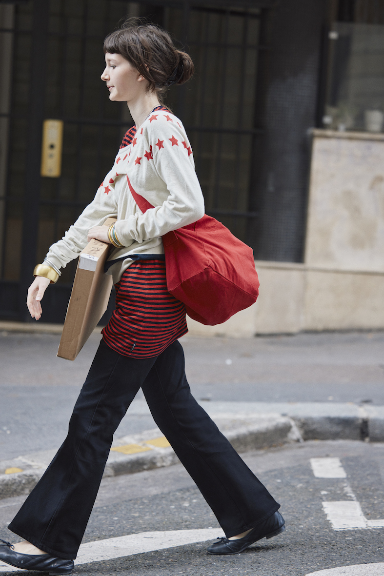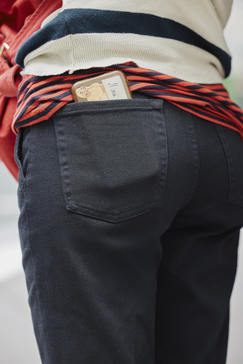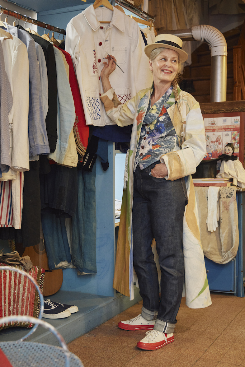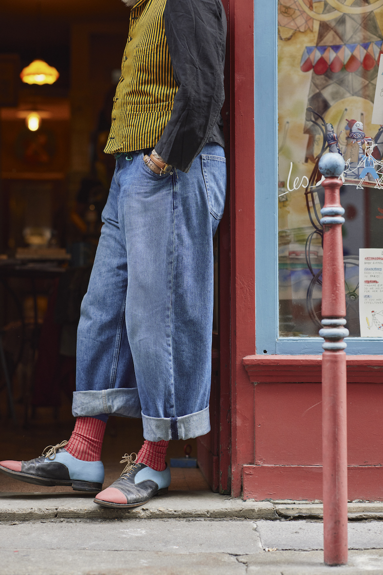 「70’s好きの私としては、フレアシルエットはとくにお気に入り! デニムを穿く時は、ヴィンテージアイテムとミックスするのが好きです」 普段は自分でパターンを起こして服をつくったり、古着を自分流にリメイクすることあるという彼女。将来はパレドトーキョー(パリにある現代アート美術館)に展示されるような作品を生み出したいと目を輝かせます。