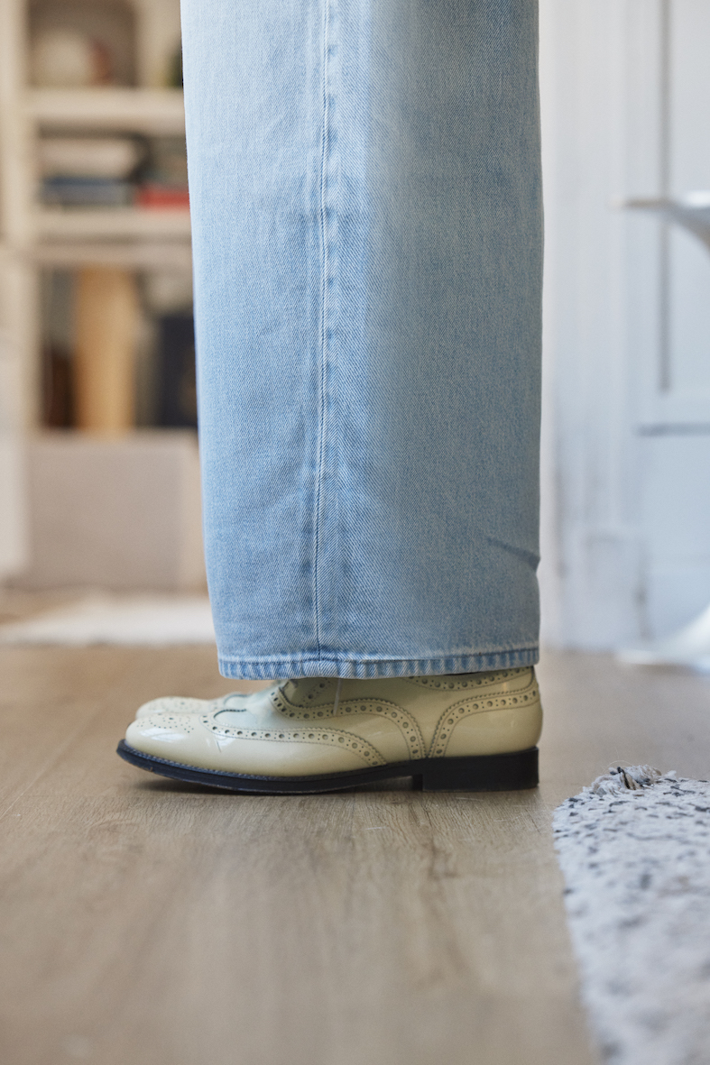 「このジーンズは、ソフトでグッドシェイプ! 洒落の効いたシェイプだからこそ、シンプルな着こなしでそのシルエット美を楽しみたいと思ったの」と、バギーカーブを選んだ理由を教えてくれました。