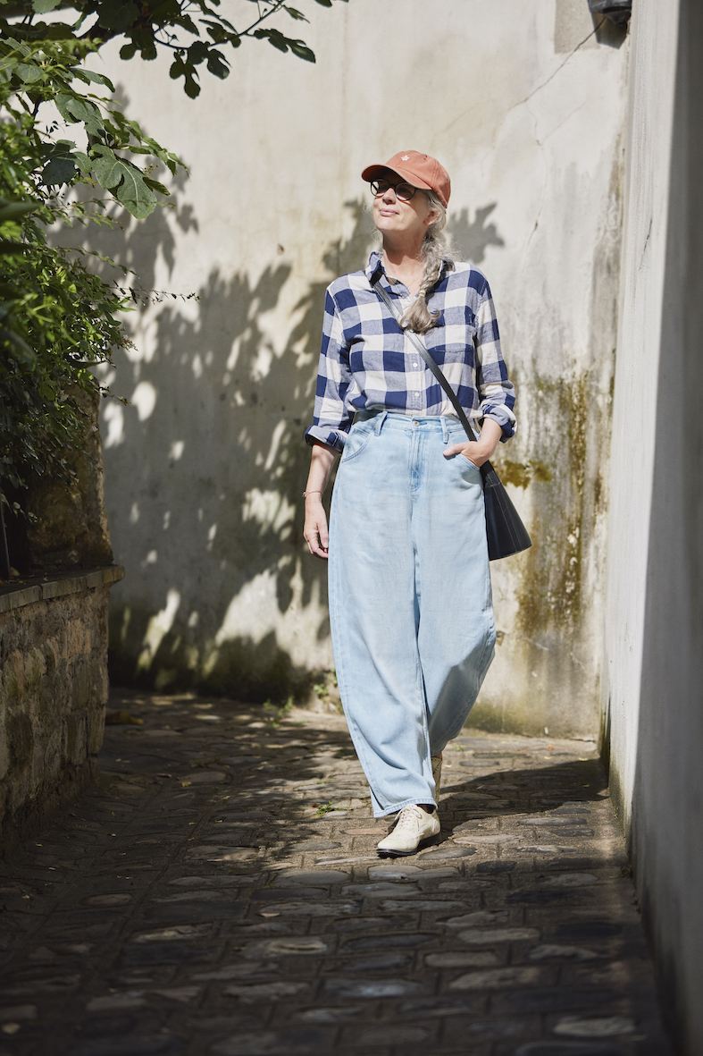 「ボトムスはぐっと大きいサイズを選んでサスペンダーで吊るのが私のスタイル。ぐるぐるロールアップしてショート丈にアレンジして、ソックスの色で遊びを加えました。柔らかい生地の感触がすっかりお気に入りになったよ」というEMMANUELさんに対し、MARTINAさんは「普段からメンズの小さめサイズをよく着ていて、マニッシュなスタイルも好きなの。上下をブルーで繋いで、柄on柄でも散らからず、シックに仕上げてみました」と今回のコーディネートを語ってくれました。
