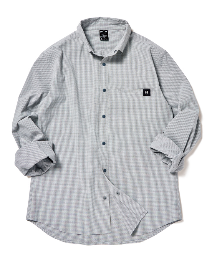 生地に虫が嫌がる成分、ペルメトリンを加工した「インセクトバリヤー素材」で仕立てたシャツ。生地の細かい凹凸が汗をかいても肌に張りつきにくくし、速乾機能にも長けた優秀アイテム。