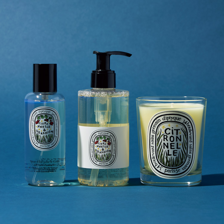 (左から)ボディスプレー[100ml]¥9130、ハンド&ボディウォッシュ[195ml]¥8250、キャンドル[190g]¥10780/Diptyque (ディプティック ジャパン)