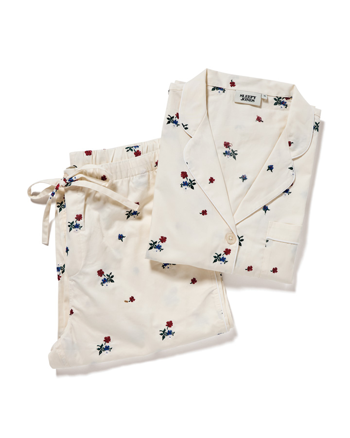 乙女心ときめく花柄刺繍のパジャマ。ホワイトのパイピングやボタンフライ仕様など、クラシックなデザインも魅力のひとつ。