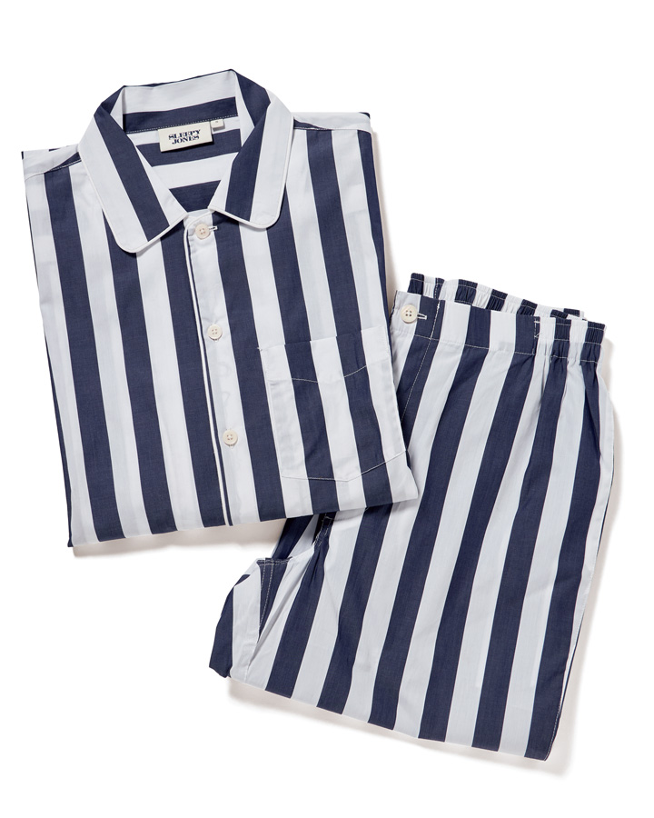 さらりとした肌触りが心地よく、丈夫さも持ち合わせるコットン100%仕立て。胸元、パンツの両サイド、ヒップにもポケットがあって実用的。シックな雰囲気が漂う、太めのネイビーストライプ。