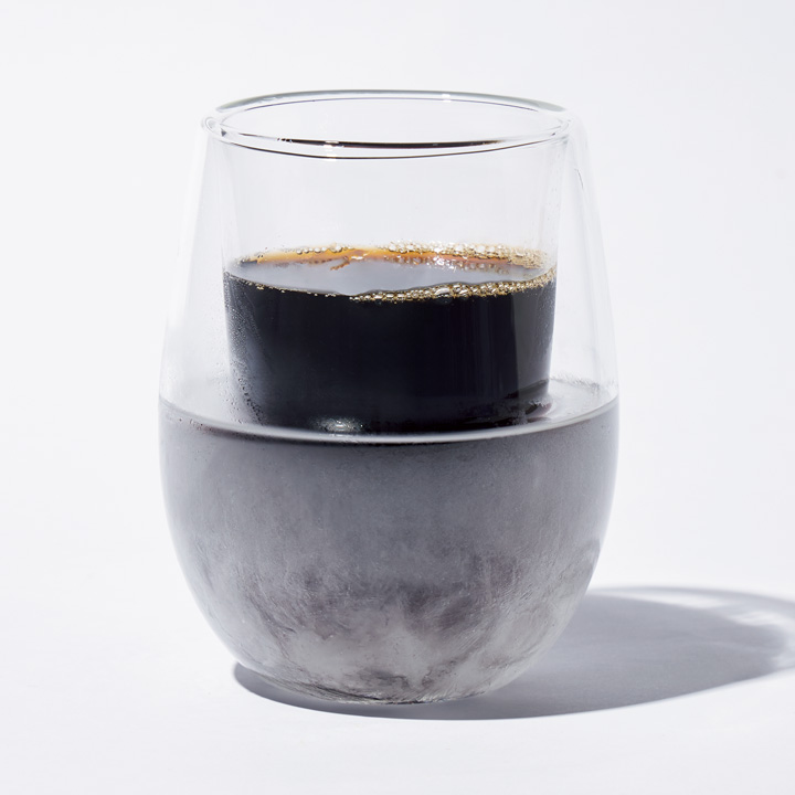 氷で味を薄めずに、でもずっと冷たいままドリンクが飲めたらいいよね。2層構造の内側に冷却ジェルが仕込まれた特別なグラスなら、その願いが叶います。使用前は冷凍庫で約4時間冷やしてね。