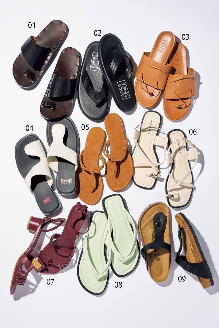 01_ニューヨークにアトリエを構える《ユッタ ニューマン》のアイテムはオールハンドメイド。馬具にも使用されるラティーゴレザーを用いた丈夫さが自慢なんだって。¥82500/JUTTA NEUMANN(ジャーナル スタンダード ラックス表参道店) 02_メイド・イン・ハワイのブランドとして世界中で愛されている《アイランドスリッパ》。ふかふかのスエード生地もいいけれど、たまには光沢感のあるスムースレザーでクールにキメてみない? ¥28600/ISLAND SLIPPER(ジーエムティー) 03_安心感のあるワイドなアッパーが、足の甲をしっかりとホールドし、快適な歩き心地をサポート。華奢な鼻緒はゴム製なので指の間にやさしく添い、長時間履いていても疲れにくいというのもいい。¥11880/FREAK’S STORE(フリークス ストア渋谷) 04_右と左でデザインが異なるユニークな「ツインズ」シリーズ。アイコンモデル「ダナ」をベースにしたトングサンダルは、ユニークなカーブデザインが素敵。モノトーンだから装いにも取り入れやすい。¥27500/CAMPER(カンペールジャパン) 05_スペイン発のシューズブランド《ラオコンテ》のレザートングは足馴染みのいいスエード仕様。ノットをあしらったストラップはぐにゃぐにゃと動くので、見た目以上にフレキシブルな履き心地。¥20900/LAOCOONTE(フラッパーズ) 06_メタルデザインのサムホールが華やかな《オゥバニスター》の1足。落ち着いた色味や細身のストラップがレディな足元を演出してくれそう。¥13200/AU BANNISTER(アバハウスインターナショナル オンラインストア) 07_ディテールやシルエットが美しい《カチム》の「チルターン」は、アンクルストラップ付きで安定感バツグン。約3.5cmのチャンキーヒールが、さりげなくスタイルアップも叶えてくれる。¥50600/KATIM(カチム) 08_まるでシャーベットみたいに美味しそうなライムグリーンにひと目惚れ。サクッと履けちゃうのでワンマイルサンダルとしても重宝しそう。¥7920/BEAUTY&YOUTH( ユナイテッドアローズ 渋谷スクランブルスクエア店) 09_メンズライクなルックスの「ギゼ」はナチュラルな風合いが魅力。足の形状を考慮した、天然ゴム混合のコルクフッドベッドはフィット感も高い。¥13200/BIRKENSTOCK(ビルケンシュトック・ジャパン カスタマーサービス)