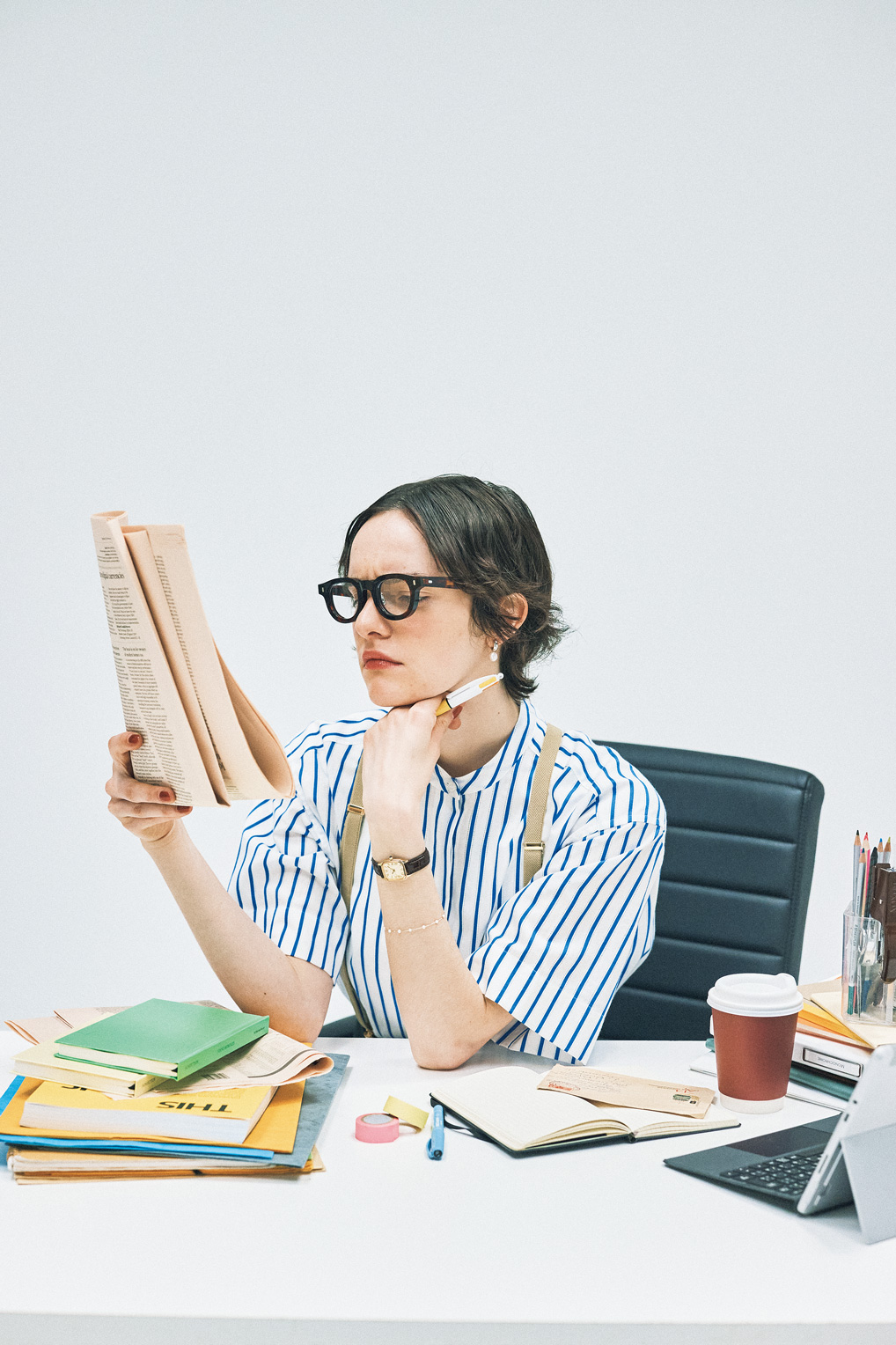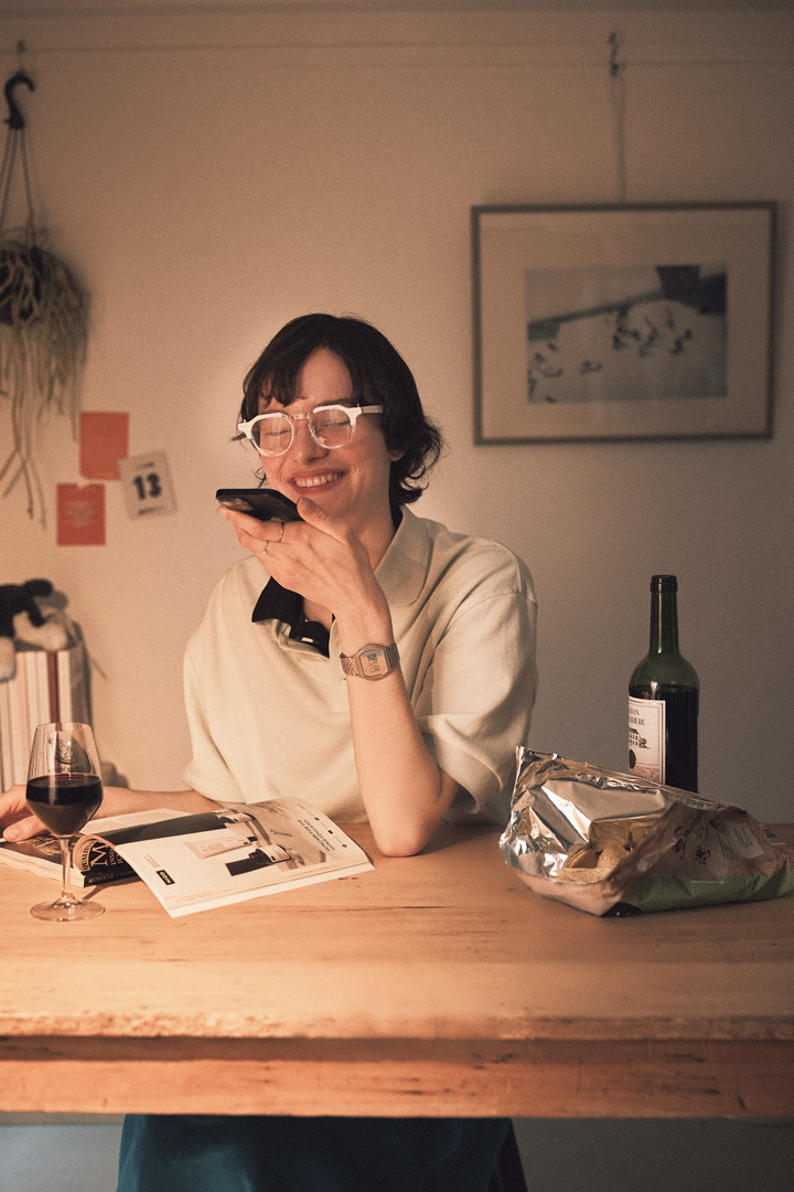 新聞を見る鋭い眼差しを支えるのは、ボリューム感のあるヴィンテージ調のセルフレーム。手首には、ゴールドのスクエアケースにクロコダイルのレザーバンドが映える腕時計をくるっと巻いて、完璧よ! クラシカルな佇まいがリンクして凛々しいでしょ。