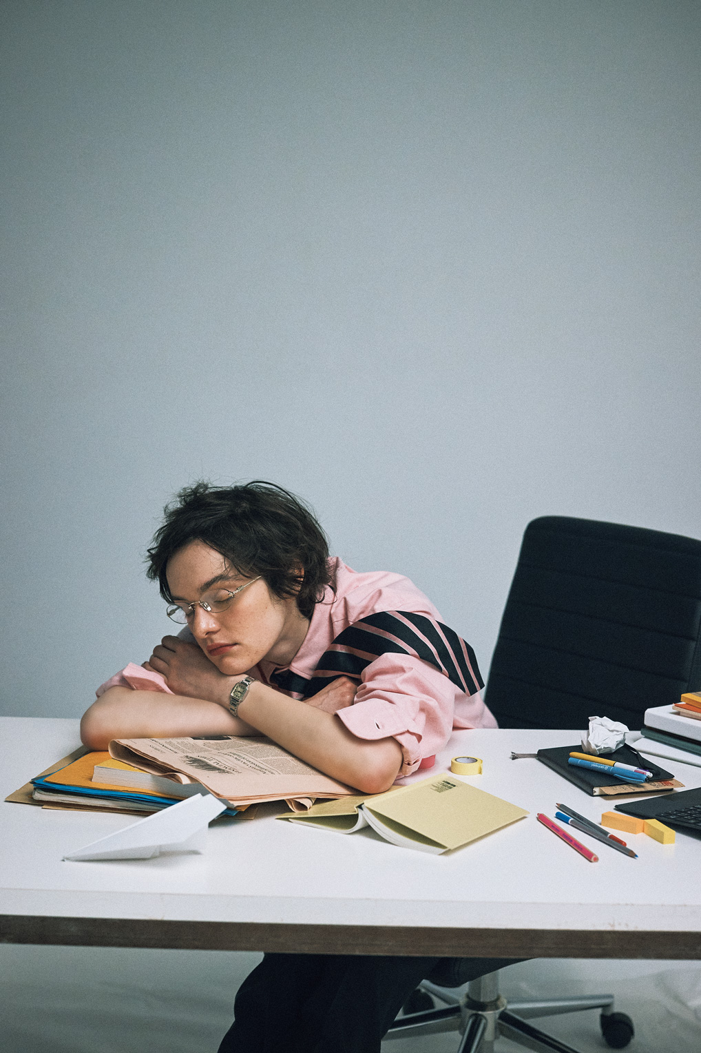 すっきりとしたリムレスフレームにオーバルレンズをセット。テンプルにあしらわれたロゴが愛らしくて、アピールしながら思わず眠ってしまった。メタルブレスレットのシャープな腕時計が指し示すのは、「21:12」。明日のプレゼンは……、いかに!