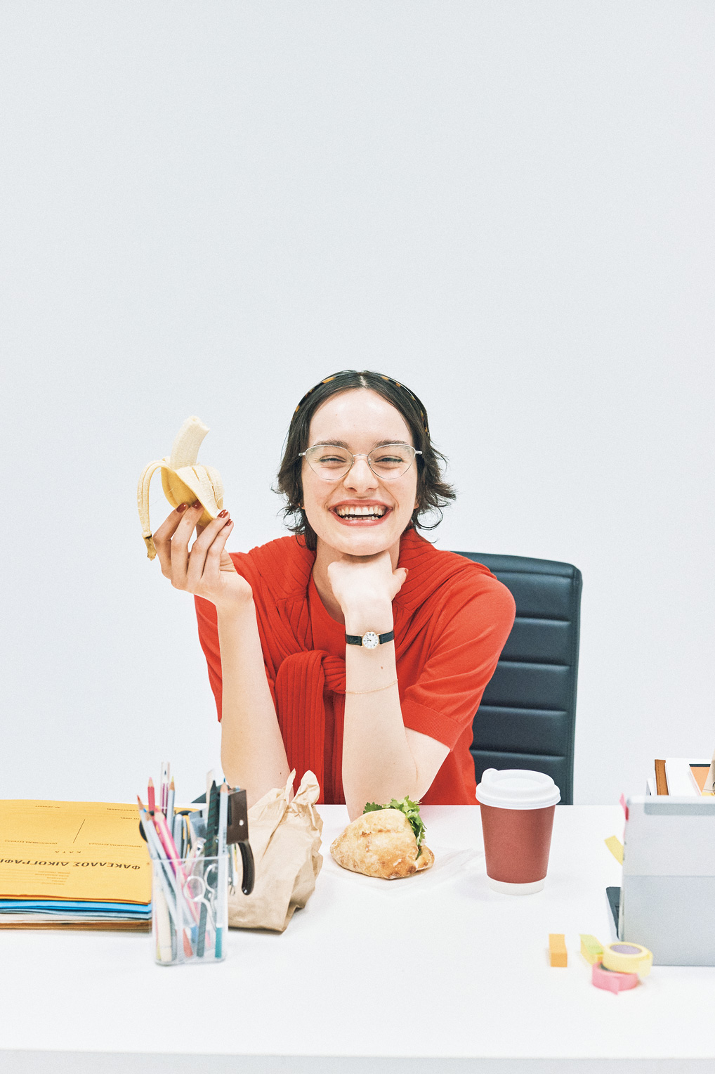 メガネ¥54780/KHAITE × Oliver Peoples(ルックスオティカジャパン カスタマーサービス)、腕時計¥206800/vintage TIFFANY & Co.(コンティニュエ エクストラ・スペース)、セーター¥37400/JOHN SMEDLEY(リーミルズ エージェンシー)、肩にかけたセーター¥27500/SLOANE×N.O.R.C(ノーク)、カチューシャ¥16500/ALEXANDRE DE PARIS(アレクサンドルドゥ パリ GINZA SIX店)、ブレスレット¥9900/michi willway(フォーティーン ショールーム)