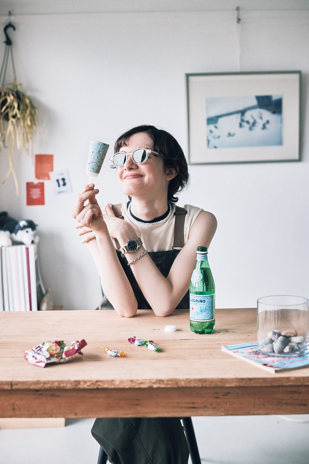 サングラス¥40700/BLANC(ライト)、腕時計¥39600/TIMEX(ウエニ貿易)、カットソー¥12100/Nicolas Jenson(リノウン)、サロペット¥21780/BEAMS BOY(ビームス ボーイ 原宿)、ネックレス¥28600/STEEN(フラッパーズ)、ブレスレット¥12100/SALONE,30(フォーティーン ショールーム)