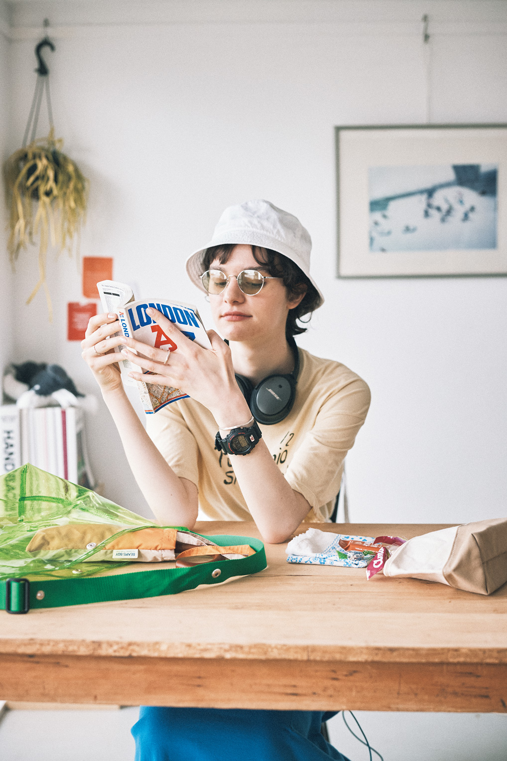 サングラス¥44000/propo(プロポデザイン)、腕時計¥16500/G-SHOCK(カシオ計算機 お客様相談室)、Tシャツ¥13200/TICCA(ティッカ)、ハット¥9900/Y(イレーヴ)、リング[中指]¥7700/Jouete(ジュエッテ)、[薬指]¥24750、バングル¥37400/ともにPLUIE(プリュイ トウキョウ)、バッグ[H39×W47×D14cm]¥7480/JULY NINE(メイデン・カンパニー)、折りたたみ傘¥6160、バンダナ¥2970/ともにBEAMS BOY、ポーチ[H15.6×W25×D8.2cm]¥4180/L.L.Bean × BEAMS BOY(以上すべてビームス ボーイ 原宿)、その他/スタイリスト私物
