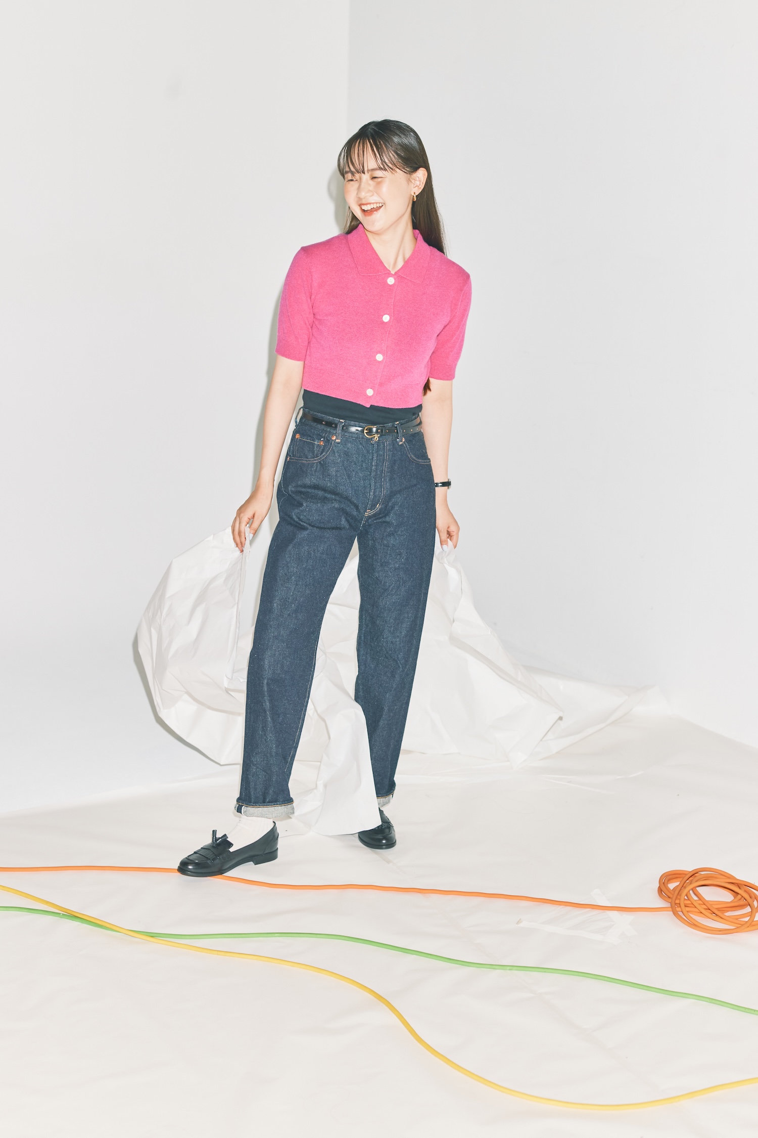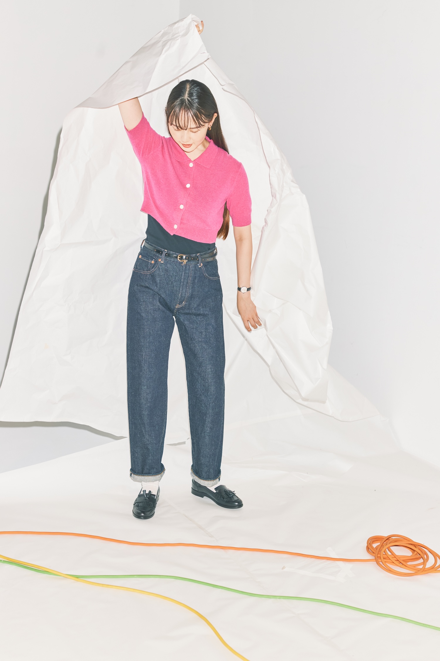 やや厚手のデニム地で、ストンと落ちるストレートシルエットが美しい《ヤエカ》のジーンズは、スタイルを問わず長く愛用できる心強い一本。いつもと印象を変えたいときは、裾をひと折りして新鮮な表情に。全体で美シルエットを叶えるなら、短めのトップスにすっきりとしたレザーシューズを合わせて。