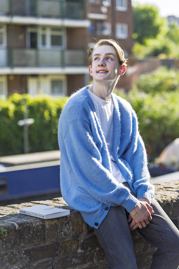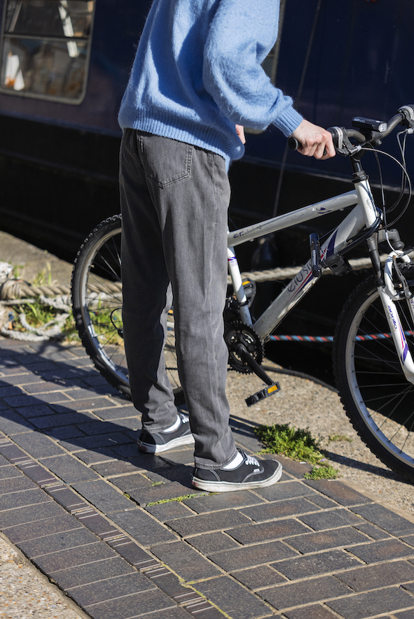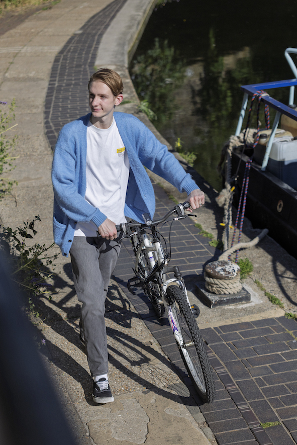 アルバイトへの往復や、入学予定の大学への道のりでもカナルを通るそうです。今ではすっかりお気に入りの場所になり、時間に余裕のある時は、ここカナルで本を読んだり、物思いに耽ったりしているそう。EZYジーンズのグレーを選んだ彼は、いろいろ考えなくても似合う寒色系のグラデーションでまとめて、自分らしいリラックススタイルを完成させました。秋の訪れが早いロンドンで、日差しの明るい季節の気配を残したフレッシュなライトブルーのニットが爽やかです。