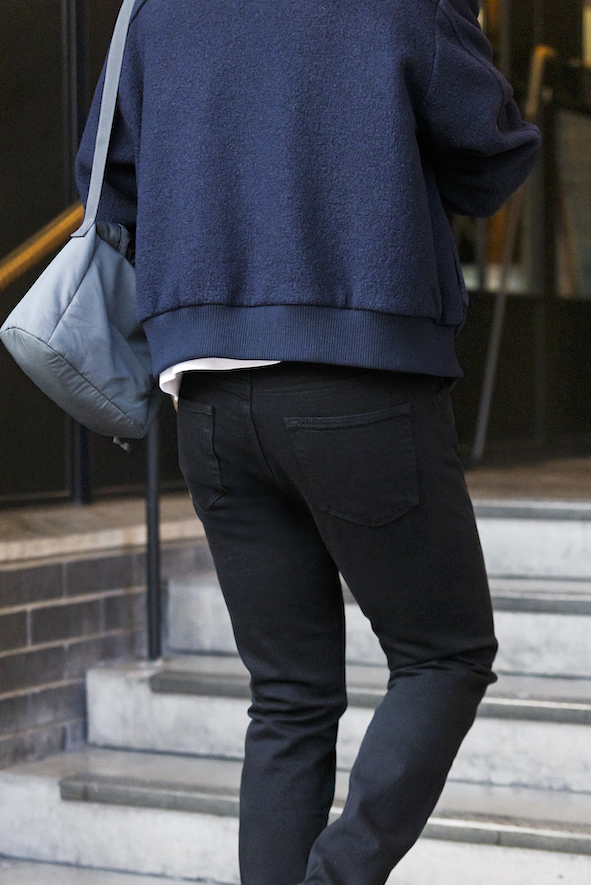 「黒色の服というのは着地が難しい色だけど、このセルビッジデニムの黒は漆黒という感じでとてもいいね。デニムなのに、この黒だからこそシックに決まる。それに、耳の色もすごくいい!」