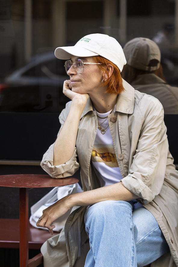 「何度も言うけど、このストレートジーンズは、本当にシルエットがキレイ! ノスタルジックな色味と色落ち感が素敵だし、今っぽいよね。ベーシックあるいはクラシックなアイテムとの相性もいい」と熱く語ってくれました。タイポグラフィが効いたキャップや、美味しそうなチップスモチーフのTシャツなど、POPにハズすテクニックも洒落ています。チップス色のソックスとデニムの色とのコントラストもキュート。さらに言えば、ビッグフレームのメガネがタレ目にお似合いでとってもキュート! 年齢を重ねても、こんなハズしテクで、こなれたカジュアルが様になる大人になりたいと思わせてくれるスタイルです。