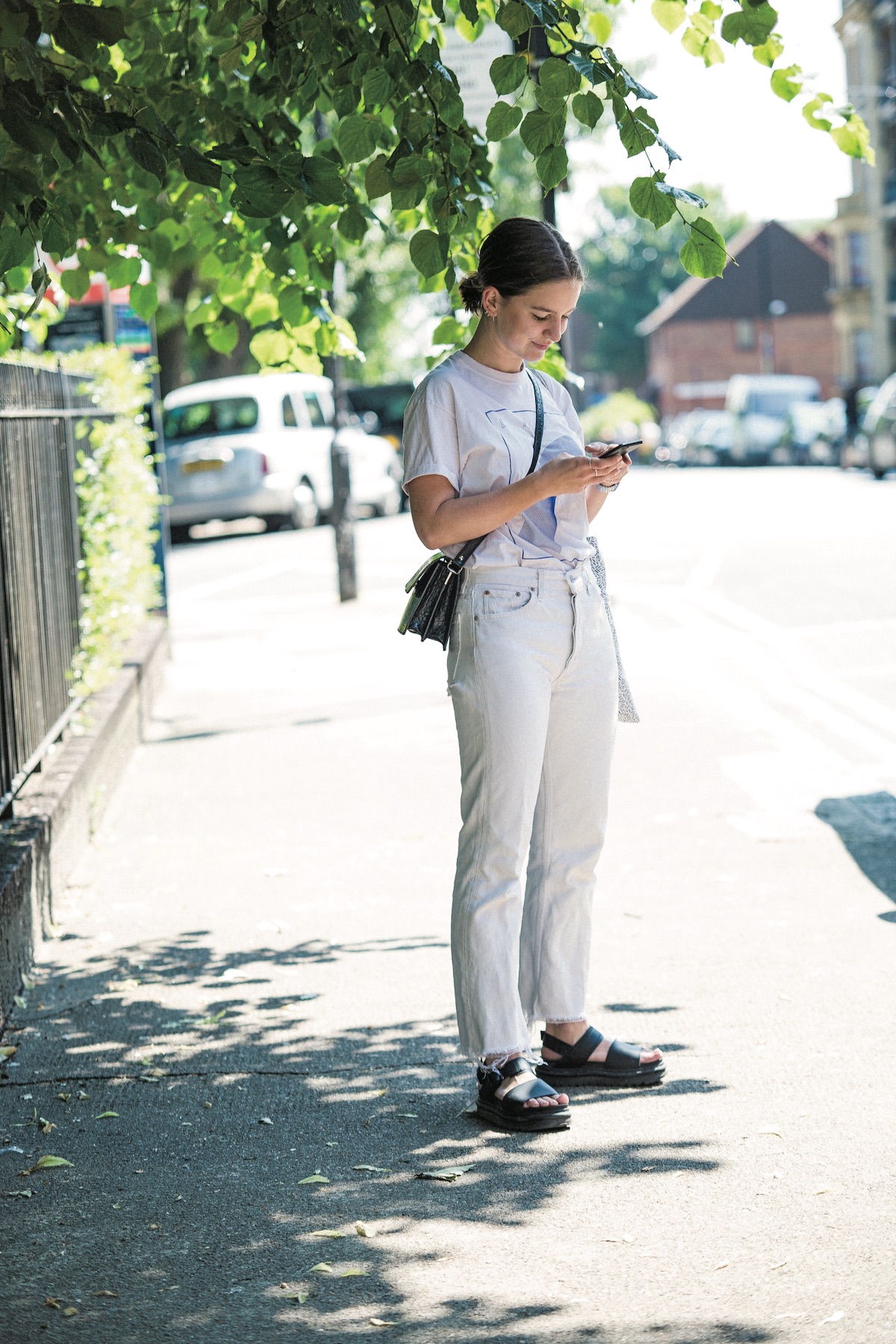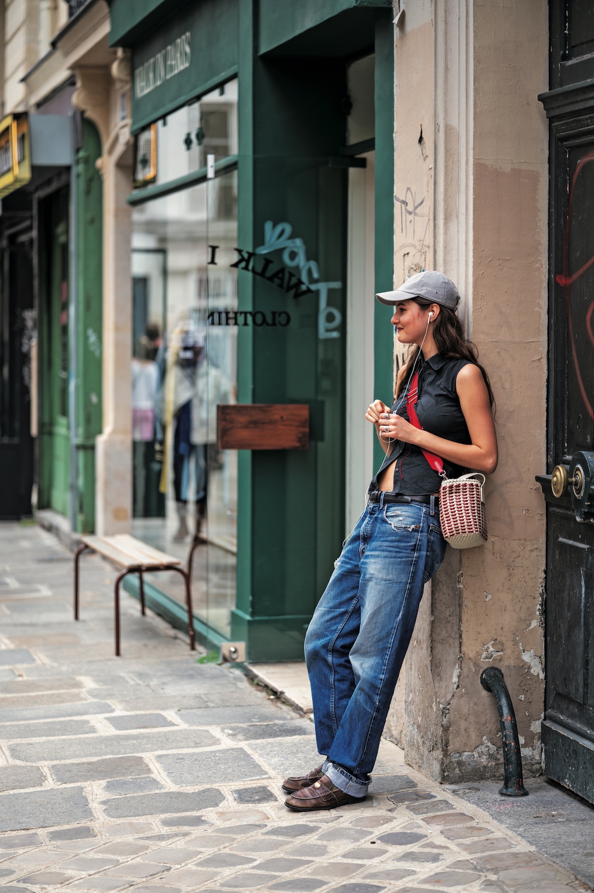 友人を待つ姿がサマになっていたイリス。コンパクトなノースリーブシャツ×ストレートデニムのスラッとしたスタイルに、小物でシーズンムードと抑揚をプラスしていた。
