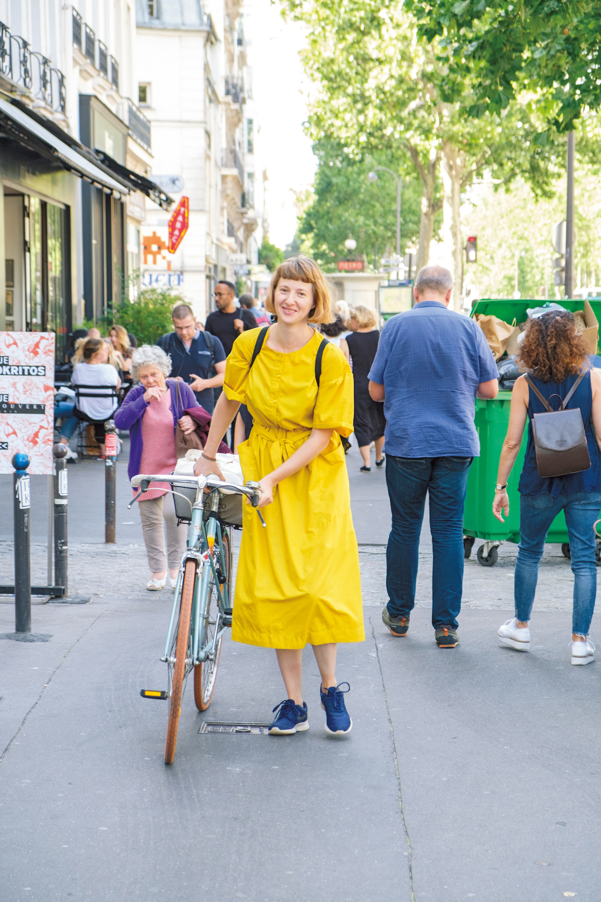 存在感たっぷりなヴィヴィッドイエローのワンピースをさらりと1枚で着こなす。足元にはブルーのハイテクスニーカーを投入し、暖色系×寒色系のコントラストが冴える遊び心のあるコーディネートに。