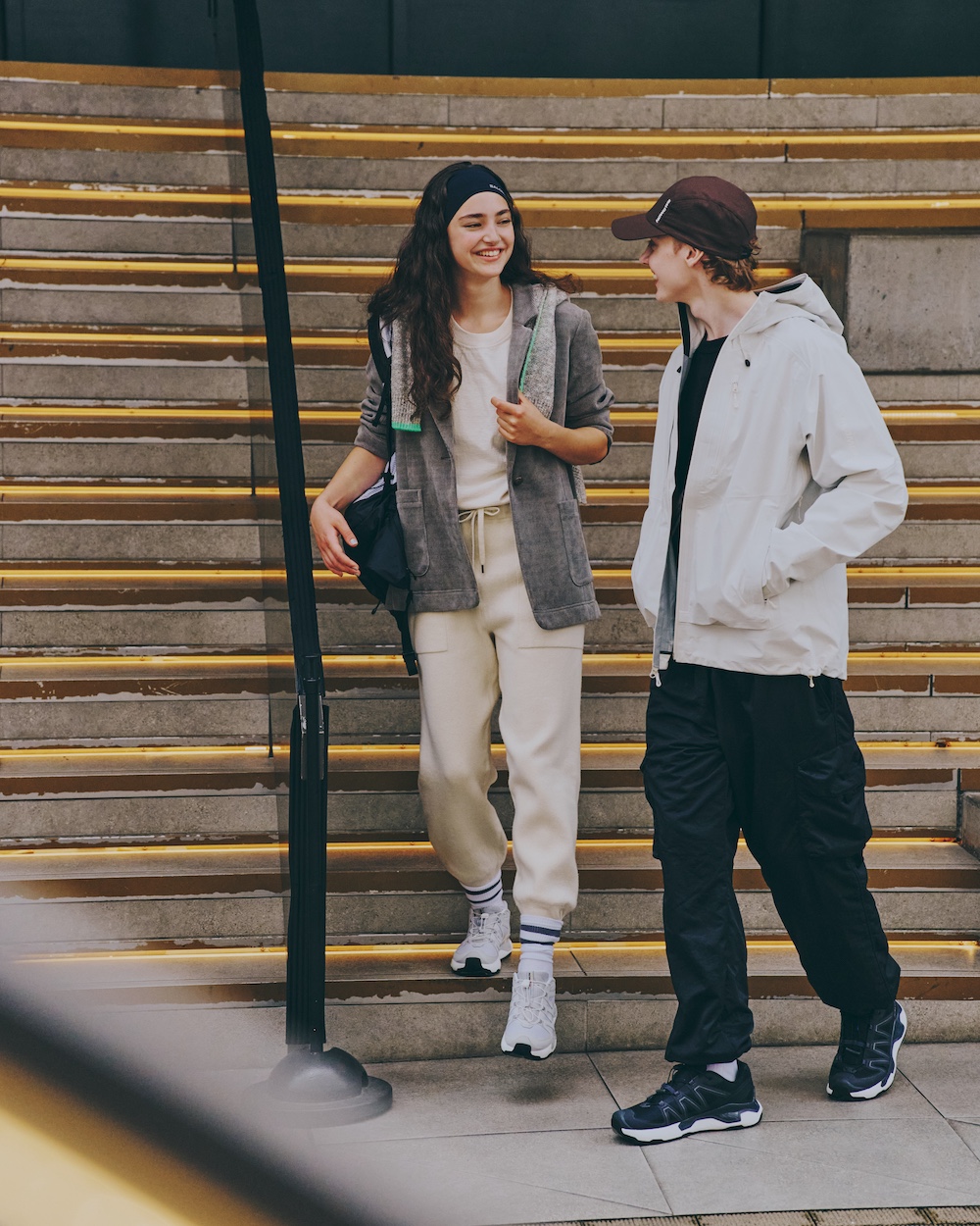 あれから意気投合した私たち、今度はきちんと約束をして待ち合わせ。好きな趣味のことや最近見た映画……たわいのない会話が心地よい。これから公園に行こうと思っていたのでお互い動きやすい服装に、もちろん足元は2人を繋いでくれた《サロモン》のスニーカー。「XC ROAM」はグリップ力が高いので、思いっきり遊びたいときに履きたい。モノトーンで揃えたところが、相性の良いコンビみたいでしょ?