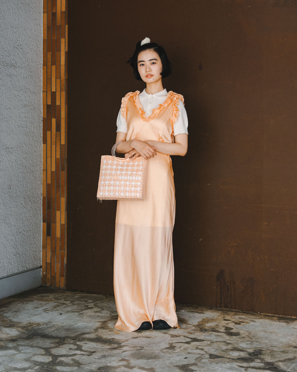 レディなムード漂うサーモンピンクのロングワンピは、ヴィンテージ特有のレトロ感も素敵。サテン素材が上品な分、黒のスニーカーでカジュアルに引き締めるのが正解。