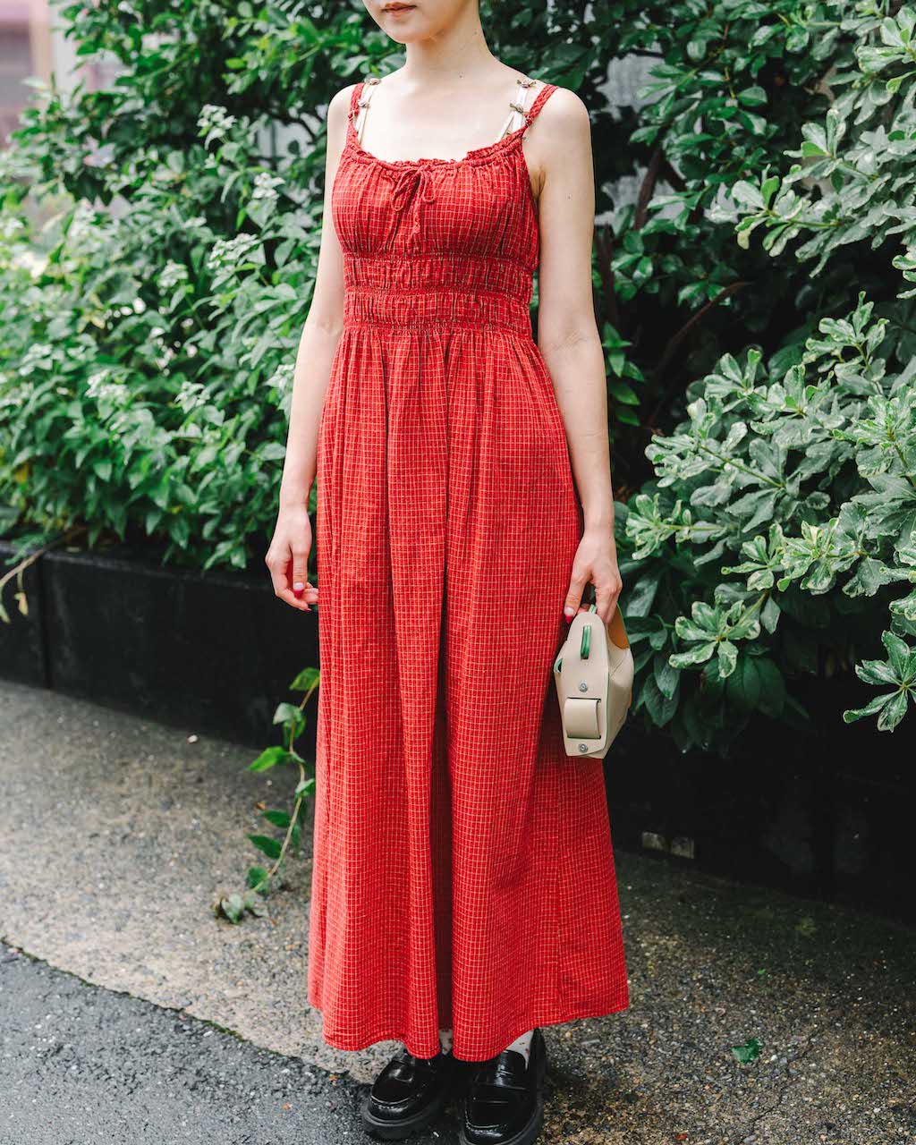 ヘルシーな肌見せが叶うノースリーブのワンピースは、ギンガムチェックのボトムを重ねてワンランク上の着こなしに。アクティブなバッグでワイルドさもトッピングしよう。