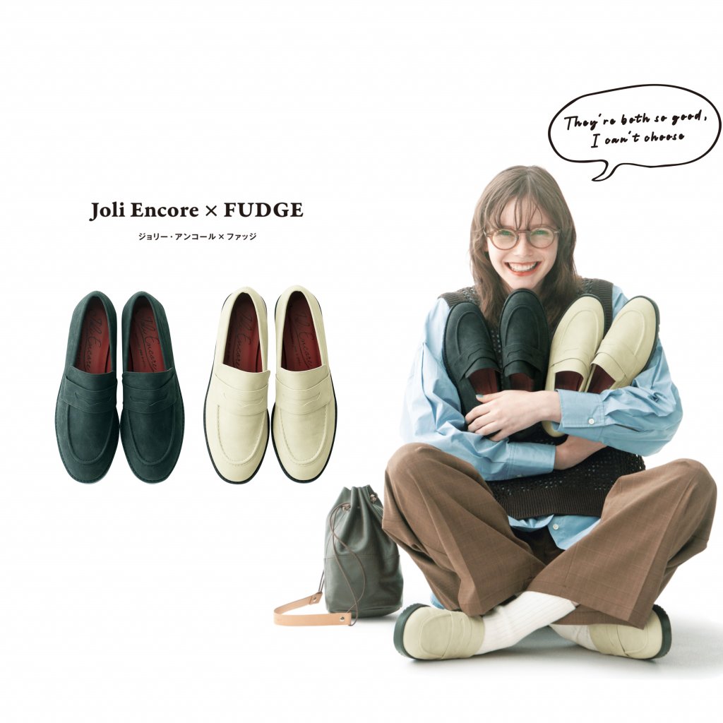 シューズブランド《ジョリー・アンコール》とFUDGE によるコラボレーション第2 弾が完成しました。前作がパリジェンヌをイメージしたメリージェーンなら、今作はロンドンガールを意識したローファーです。こだわったのはどんなスタイルにも似合うこと。そして出来上がったのがスエードアッパー×ラグソールを組み合わせた「パフ ステップ」なのです。アイビーはもちろんカジュアルまでOK。秋冬の装いを盛り上げる最良の1 足をぜひ。