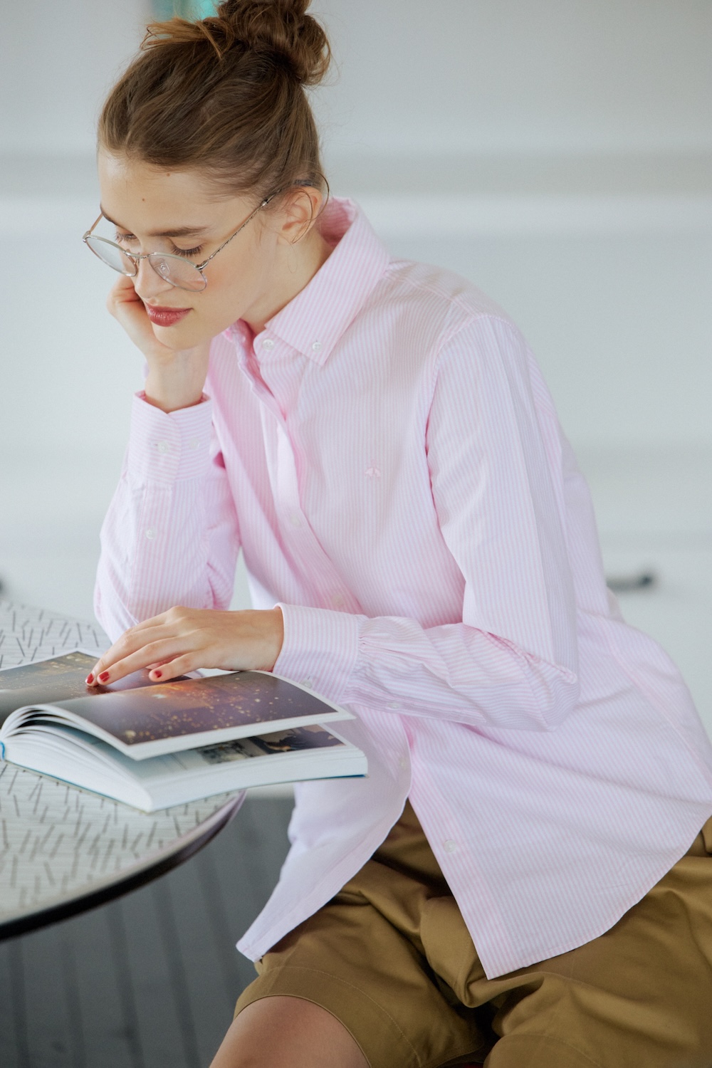 言わずもがな好相性なボタンダウンシャツとチノパンツの組み合わせ。トラッドカジュアルの基本とも言えるこの着こなし、今時期なら「ひざ上のハーフ丈」のチノパンを選ぶのも手。残暑の時期に涼しく着られるだけでなく、こなれ感も演出できて、どこか垢抜けた印象に。足もとはローファーで品よく締めたら完璧! タイツやハイソックは穿かずに潔く肌見せするのもポイント。