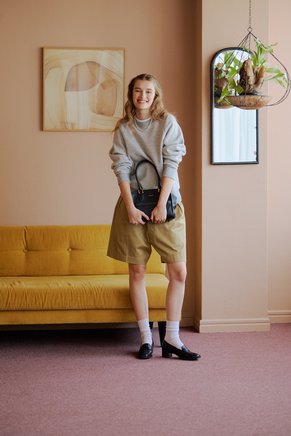ポテンシャルの高いベージュのチノハーフパンツは、グレーのスウェットと組み合わせても難なく決まる。ひざ上丈ならではの肌見せが適度な抜け感を引き出して、小ワザを使わずとも雰囲気のいいカジュアルお洒落さんの装いに。ブラックのレザーバッグとシューズで着こなしを締めるとよりトラッドなまとまりが出て◎。