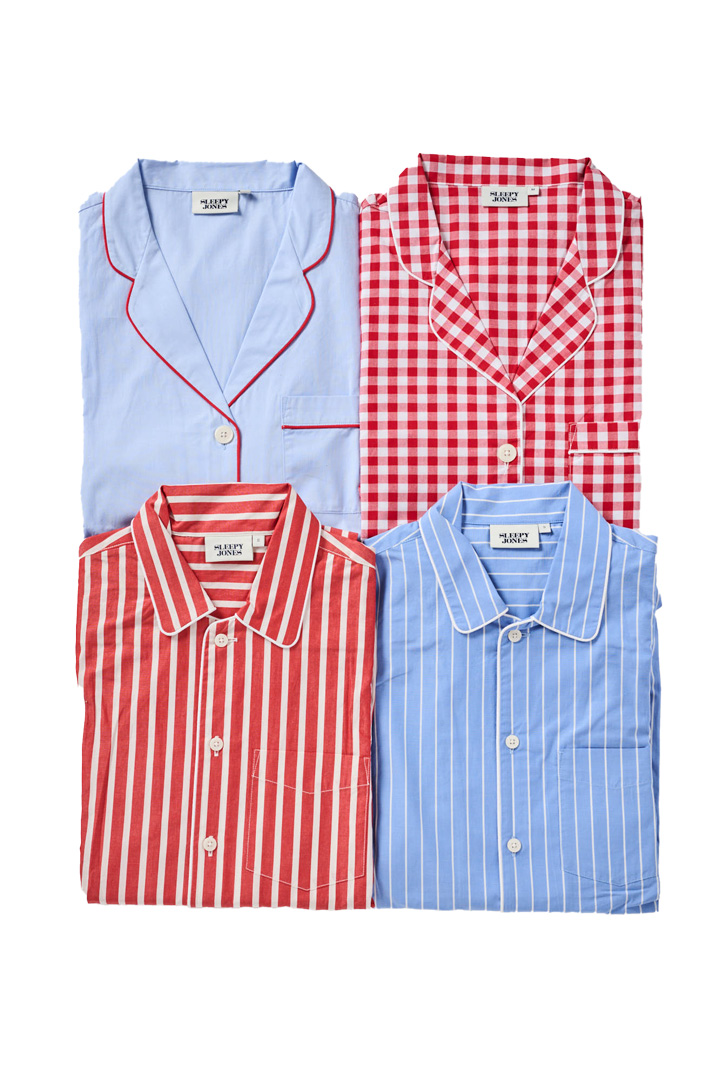ニューヨーク発のラグジュアリーラウンジウエアブランド《スリーピージョーンズ》のパジャマセット。細い糸で織り上げたコットンを使用しており、肌触りなめらか。丸みのあるカッティングが愛らしい開襟タイプと、レギュラーカラータイプ、どちらがお好き?