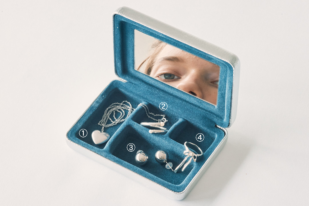 1_甘くなりすぎないマットな質感。ハートネックレス¥28600 / MARIHA(マリハ) 2 _くるりと包み込むようなシルバーリングに、小粒のパールがちょこんと2 粒。リング[パール]¥14300/Citlali(シトラリー) 3_パールとはまた違った品格をもたらす、プラチナの球体ピアス。直径10 mm の大ぶりサイズ。ピアス¥35200/ MONICE(フォーティーン ショールーム) 4_ 今にも風に揺れそうな繊細なリボンモチーフ。リング¥31900/ PLUIE(プリュイ トウキョウ)