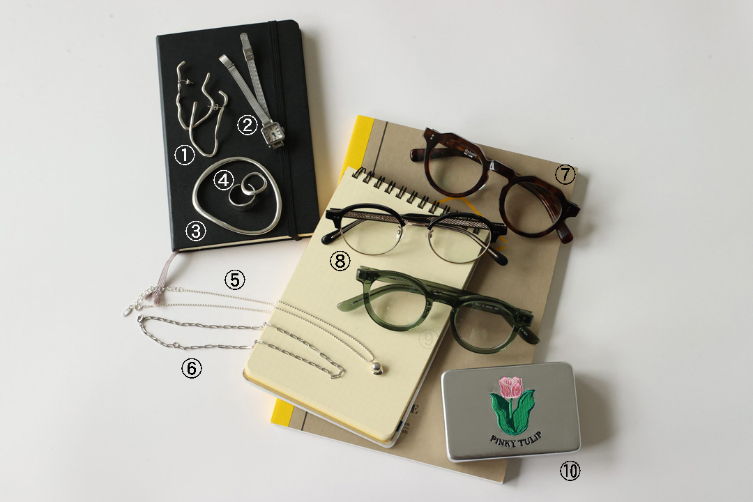 1_ 左右非対称のやわらかく有機的なデザイン。ピアス¥35200 / PLUIE(プリュイ トウキョウ) 2 _ ブルーのスチール針が時間を美しく示す。時計¥29700 / MATOW(エイチエムエスウォッチストア表参道) 3_ 流れるような優美なカーブが特徴。バングル¥48400 /e.m.(イー・エム 青山店) 4 _(左)ボリューミーでいて、繊細なニュアンスを感じさせる。リング¥9900 /Jouete(ジュエッテ)、(右)シンプルながら動きのあるフォルム。重ね付けにもおすすめ。リング¥18700 /e.m.(イー・エム 青山店) 5_ パールの影を表現した、アンニュイな輝き。ネックレス¥41800 / SIRI SIRI(シリ シリ) 6_ 繊細なチェーンの連なりが、装いを都会的な印象へ昇華させる。ネックレス¥20900 / MARI HA(マリハ) 7_ 上部を直線的にカットしたデザインで、目元をさり気なく印象的に。メガネ[レンズ込み]¥23100 / Reboot(パリミキ) 08_ 知的なブロウタイプは、曲線的なフォルムならトライしやすい。メガネ¥46200 / propo(プロポデザイン) 9_ 太いフレームで目元を強調しつつも、クリア素材で程よく抜けた印象に。メガネ¥36300/YELLOWS PLUS(コンティニュエ) 10_お気に入りのアクセサリーをケースに入れて携えておけば、気分を高めたい時のお守りに。ミラー付ケース[ H2.4 × W10 ×D7cm]¥2090/JOliJOli( ヘミングス)