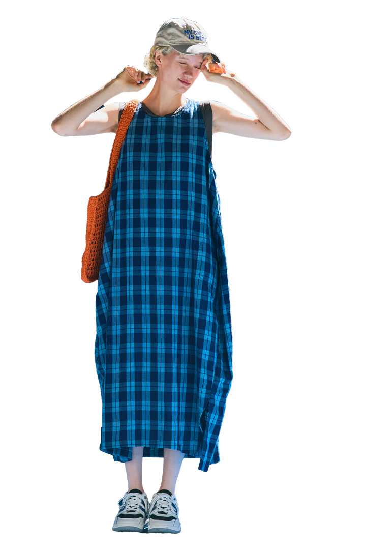 ワンピース¥31900/OMNIGOD(ドミンゴ)、タンクトップ¥8800/LOISIR(ロワズィール)、キャップ¥8580/BLUESCENTRIC(メイデン・カンパニー)、バッグ¥7590/THE BAGMATI (セムインターナショナル)、スニーカー¥23100/KARHU(ジャーナルスタンダードラックス表参道店)