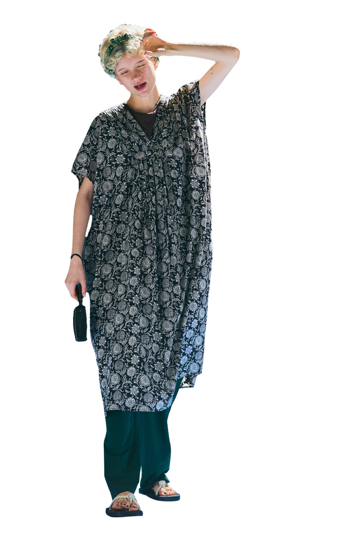 1枚でも存在感アリ!レトロな雰囲気の花柄ワンピース。リラックス感のあるパンツを差して甘さを中和。汗だくでもOK。お洒落バンダナが受け止める。
